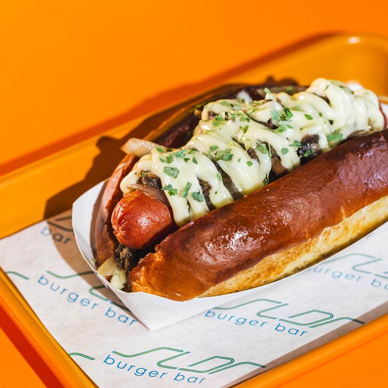 Certified Angus beef hot dog, white truffle mayo sauce, mushrooms, caramelized onions.